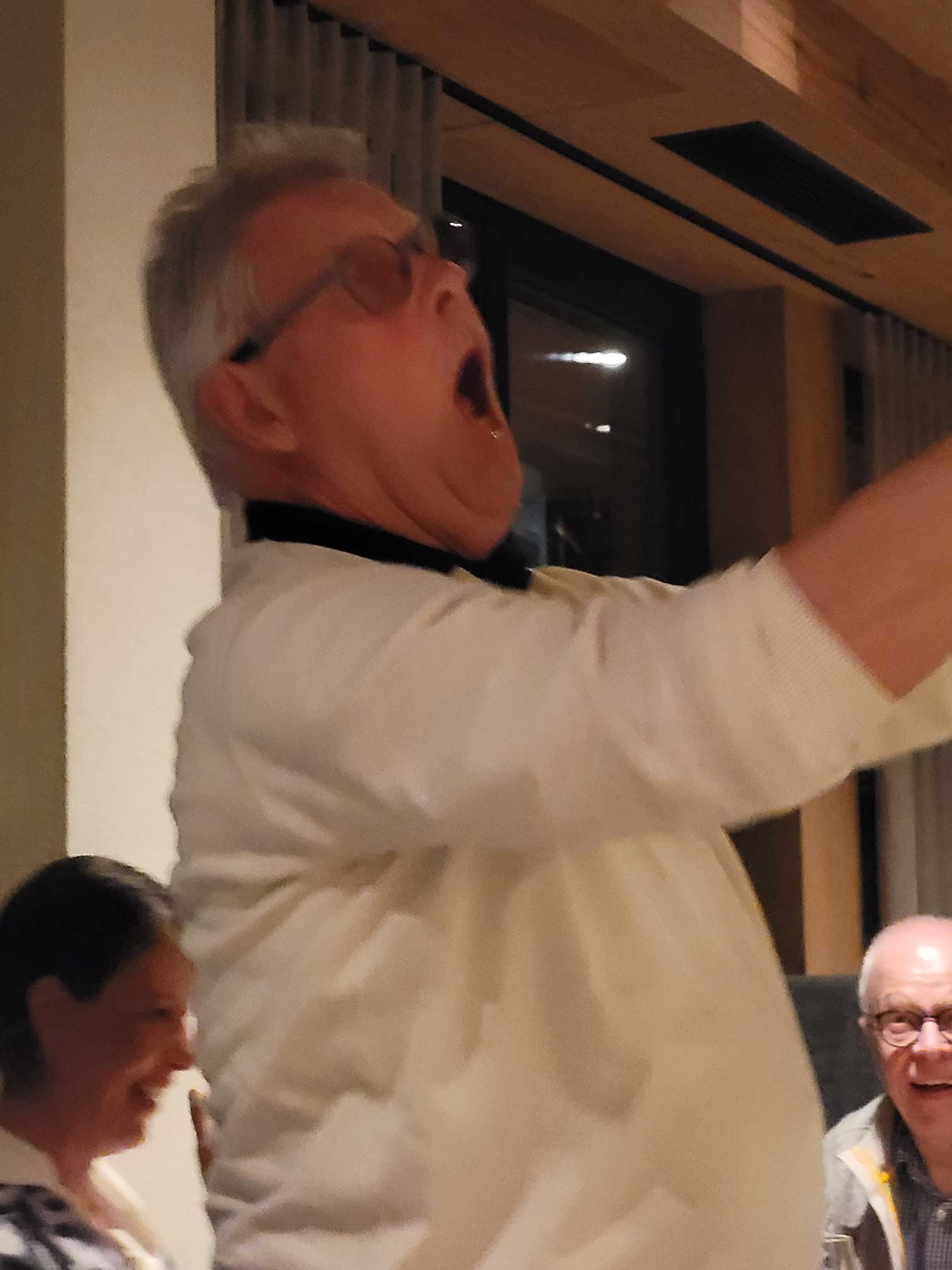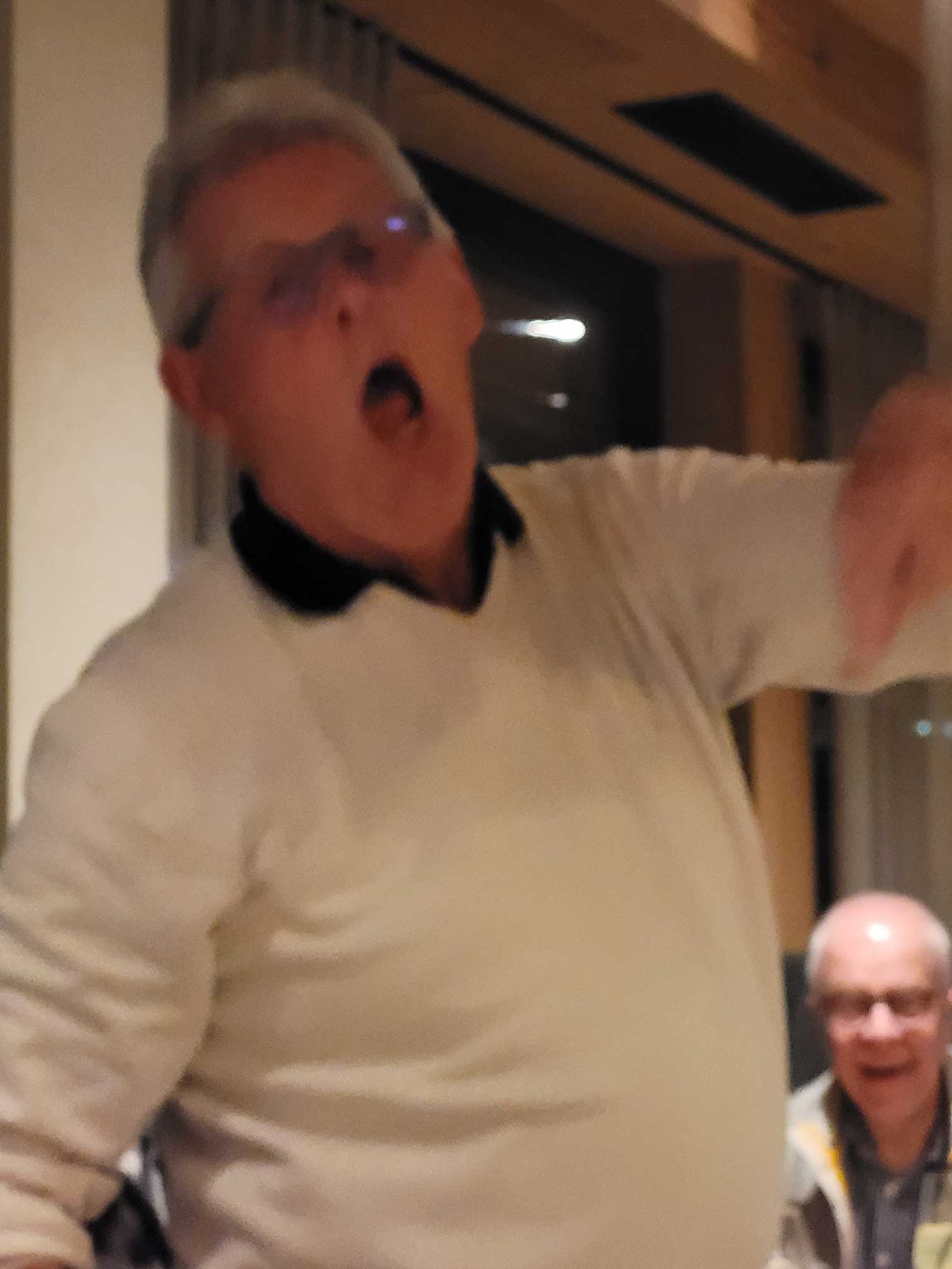 Die Abende wurden in geselliger Runde verbracht, Kurt zeigte gern, wie bei der neuen Vereinsaktivität „Tanzen“ getanzt wird. Wie man auf den Fotos zu sehen ist, muss es anstrengend sein, der sperrangelweit geöffnete Mund deutet auf Schnappatmung hin. Es gab auch wie im letzten Jahr nach den Abendessen eine Märchenstunde und einen Vorleseabend. Danke an Martina und Ruth.